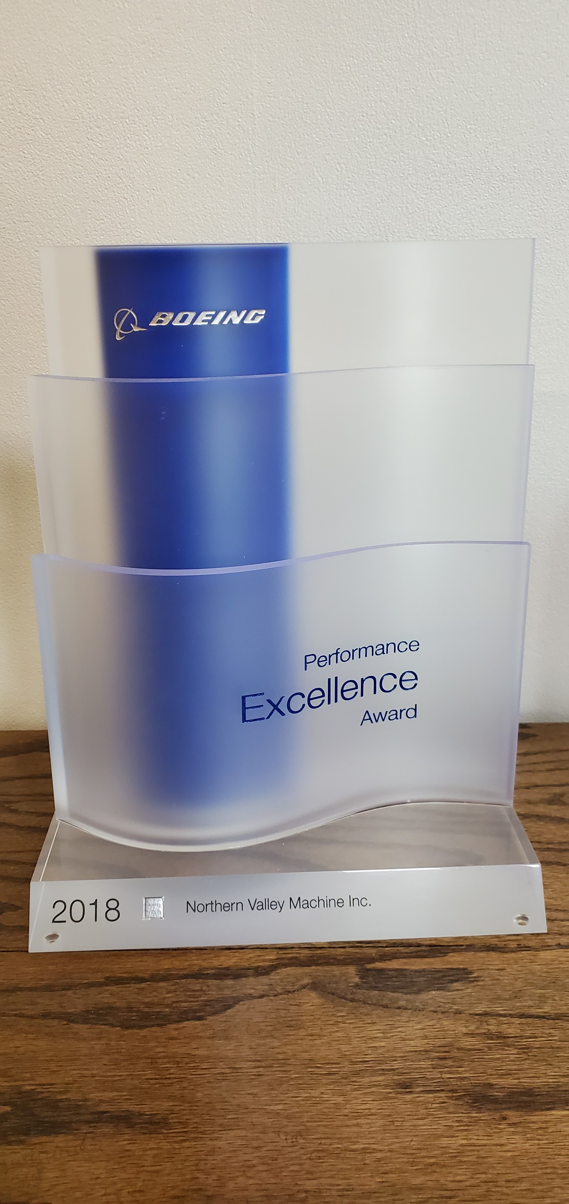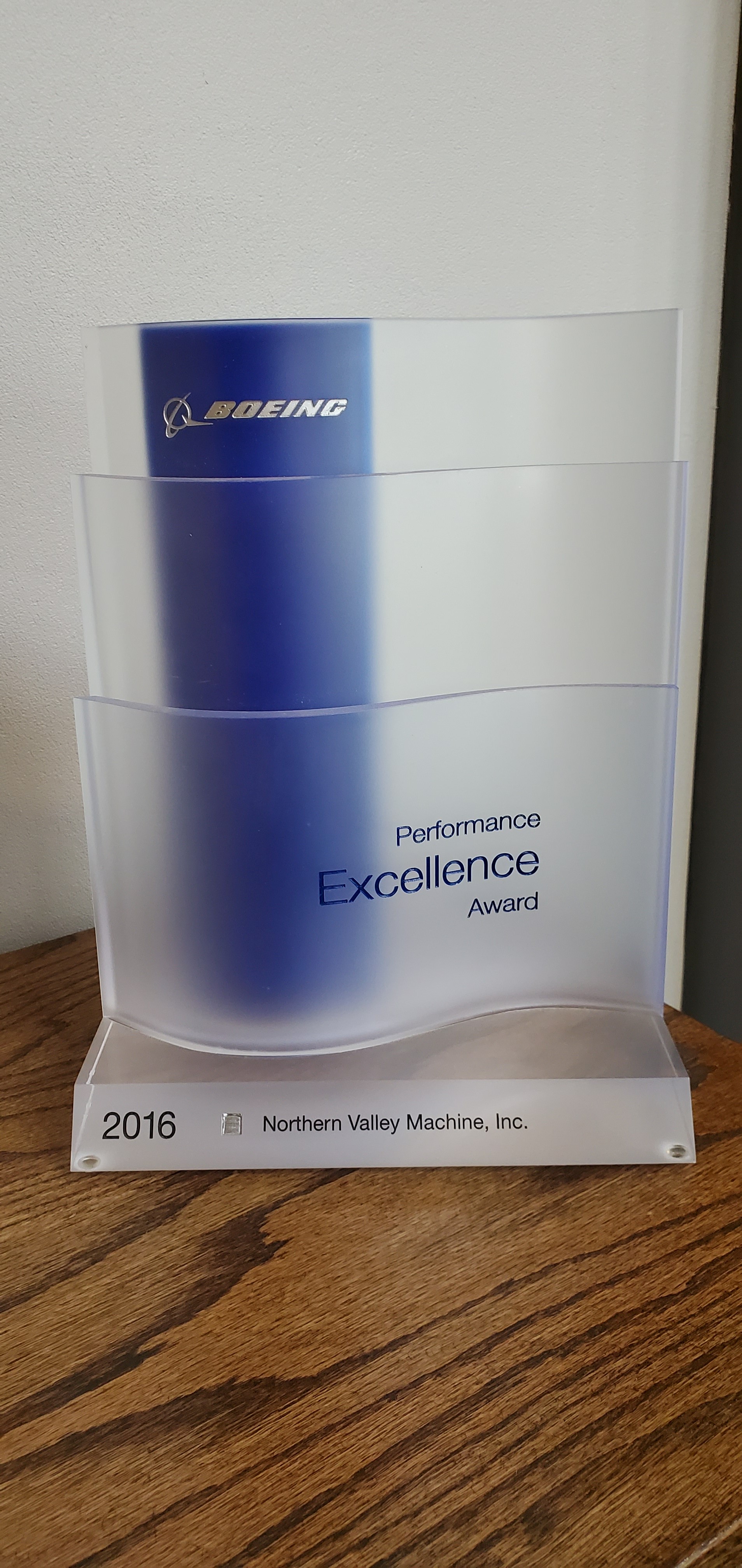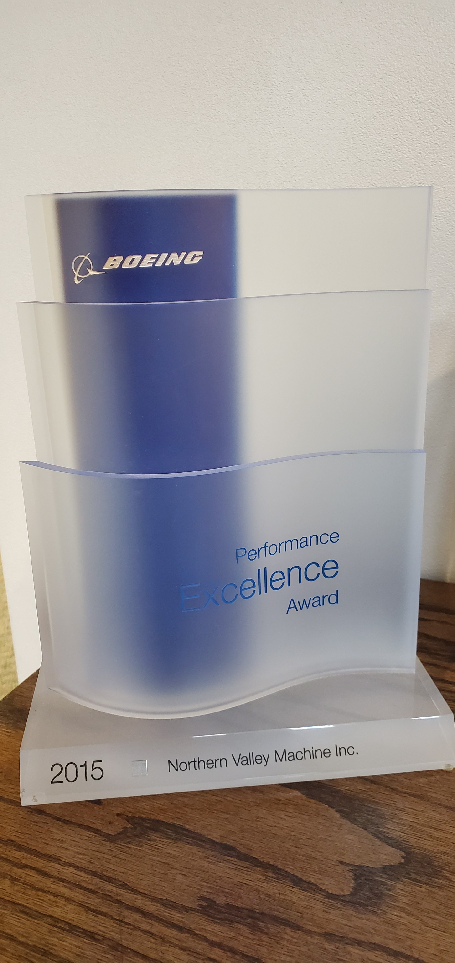 Northern Valley Machine, Inc. was named a 2019 Boeing Supplier of the Year. Boeing, the world's largest aerospace company, recognized Northern Valley Machine, Inc. for outstanding performance in its Global Supplier Diversity category.